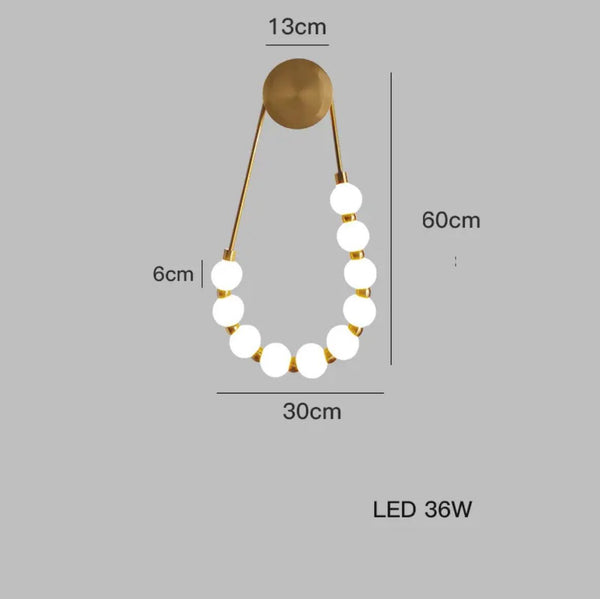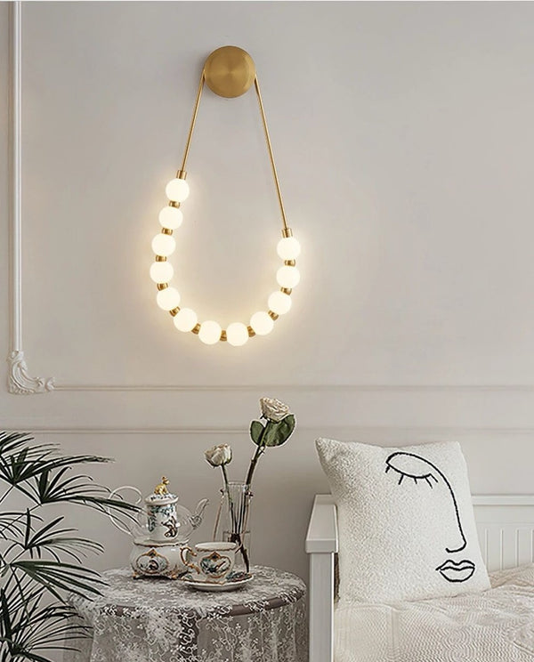 Sublimez vos murs avec l’applique murale "Collier Lumineux Or". Inspirée d’un collier de perles, ce luminaire arbore une structure métallique dorée associée à des sphères lumineuses en verre opalin pour une lumière douce et apaisante. Son design moderne et raffiné est parfait pour apporter une touche d’élégance à vos chambres, salons ou entrées.