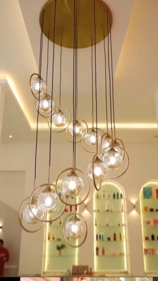 Offrez à votre intérieur un effet visuel spectaculaire avec ce lustre en cascade dorée. Une multitude de globes en verre transparent, suspendus à différentes hauteurs, créent une illusion de pluie lumineuse qui transforme l’ambiance. La base en métal doré ajoute une touche de modernité chic et diffuse une lumière chaleureuse dans tout l’espace.