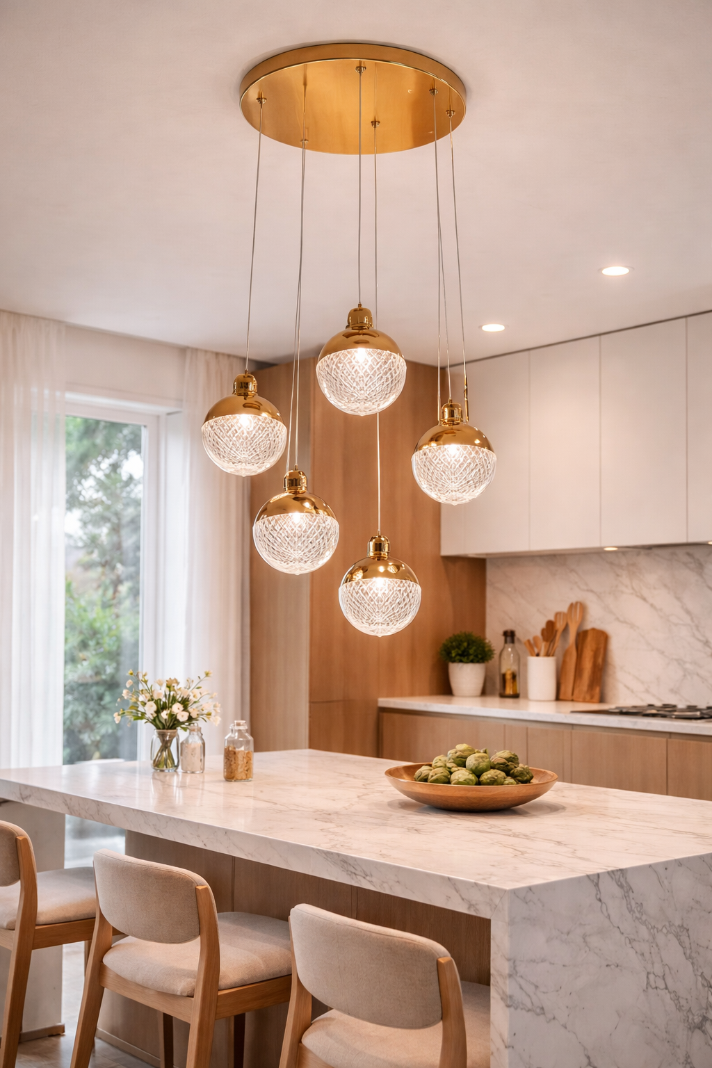 La suspension "Nourane" apporte une touche de raffinement et de brillance à votre intérieur grâce à son jeu de cinq boules en cristal taillé suspendues à différentes hauteurs. Chaque globe est sublimé par une finition dorée brillante, donnant une allure à la fois moderne et luxueuse. Cette suspension est idéale pour les salons, les salles à manger ou les cages d'escalier, où elle crée un effet visuel élégant et lumineux. Le verre structuré capte la lumière pour la diffuser avec douceur, parfaite pour une ambiance chaleureuse et conviviale dans les maisons marocaines. Un choix chic et sans excès, qui combine fonctionnalité et esthétique.